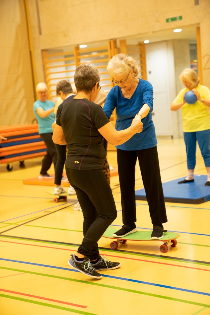Wir trainieren Beweglichkeit, Gleichgewicht, Kraft in den Extremitäten und wappnen uns so vor der Sturzgefahr im Alter. Ab und zu ein leichtes Spiel oder Volkstänzchen bereichern unseren Geist und laden ein zum kameradschaftlichen Austausch.